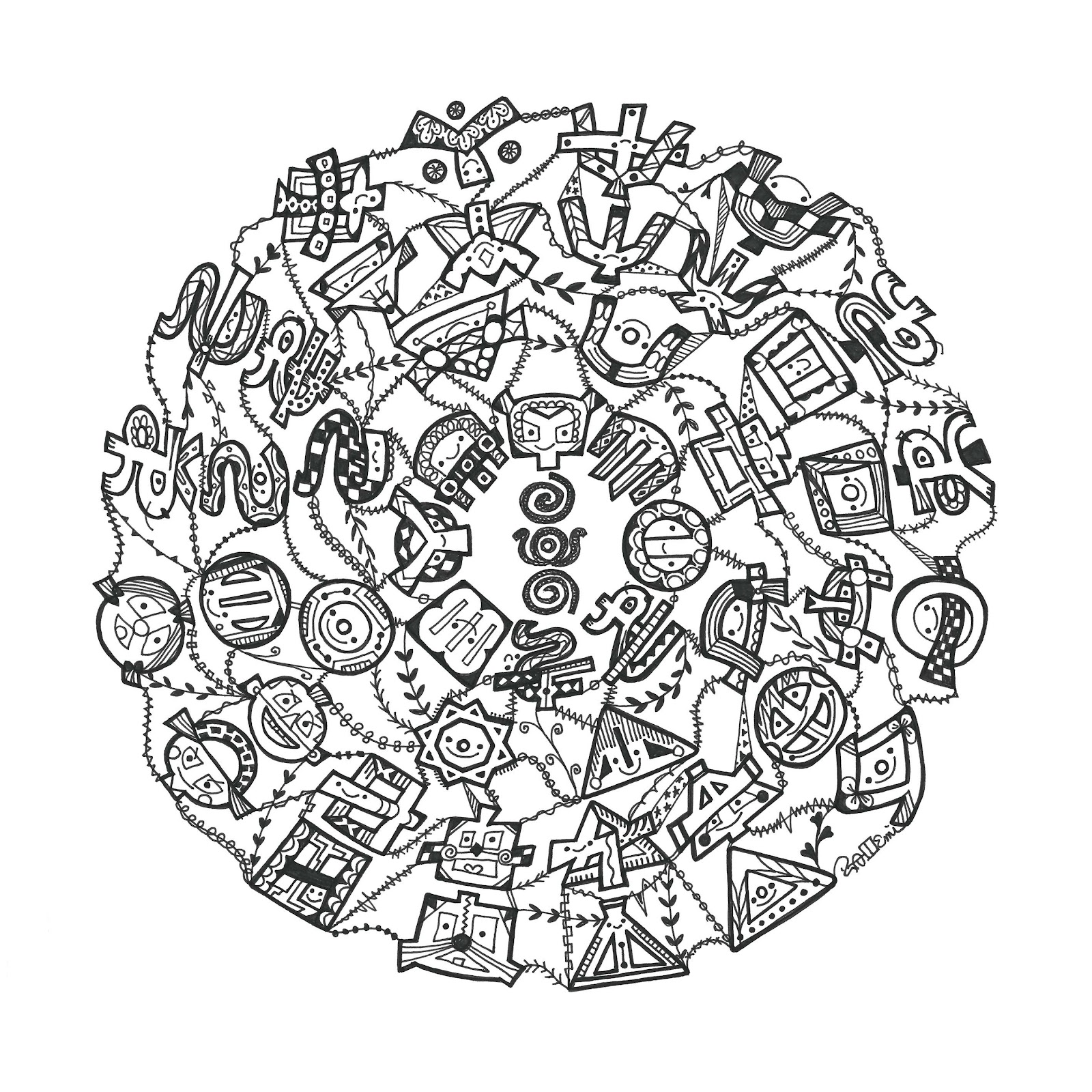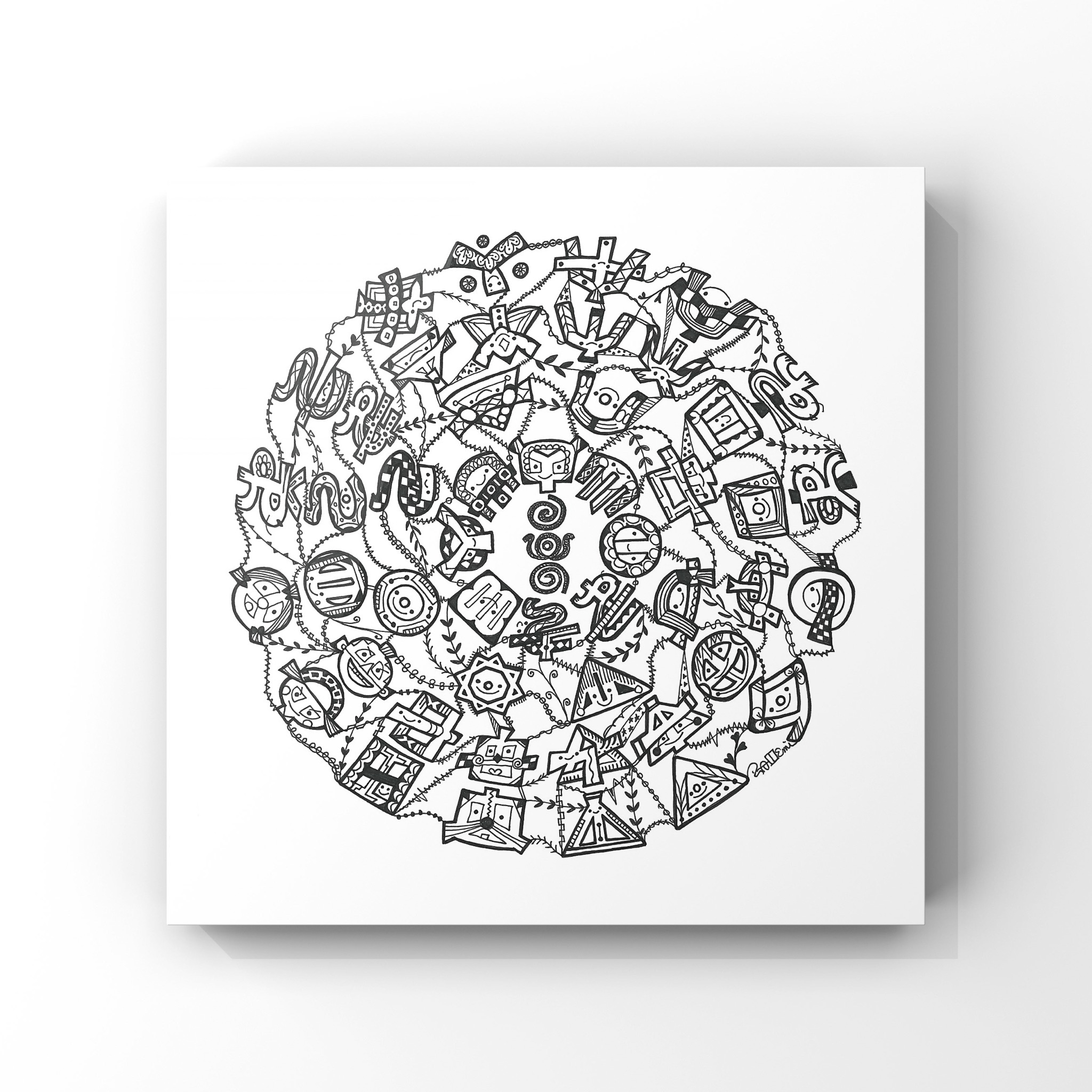 この作品は、円形のフトマニ図をベースにデザインされた作品で、神秘的なシンボルが可愛らしいキャラクターたちで表現されています。白黒のシンプルな配色が、古代のフトマニ図の厳粛さと現代的な遊び心を見事に融合させています。各文字が個性的なキャラクターとして描かれ、図全体に調和と親しみやすさを与えています。この作品は、宇宙や自然の法則を表すフトマニ図に、可愛らしさと独創性を加えたもので、見る人に神秘と楽しさの両方を感じさせます。「神さまの座席表」として、神聖さと可愛らしさが同居するユニークな世界観を表現しています。