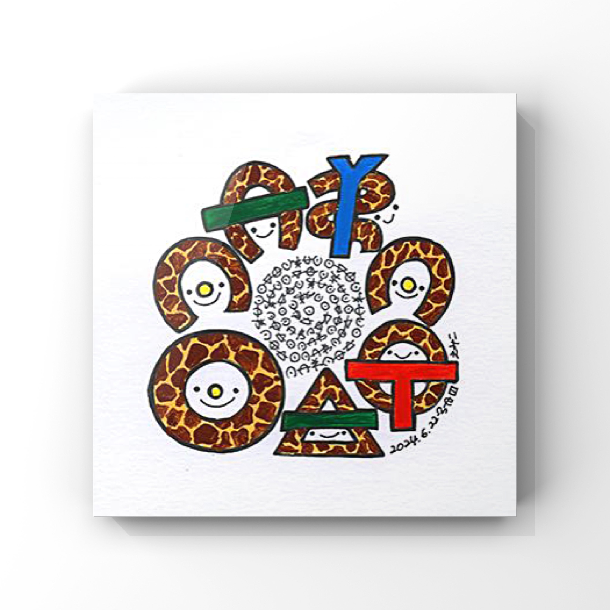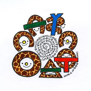 この作品は、ヲシテ文字で「愛しています」と描かれたユニークな作品です。各文字はキリン柄をまとったキャラクターとしてデザインされ、ヲシテ文字の神秘的な美しさと、キリンの優雅さ、親しみやすさが見事に融合しています。ヲシテ文字の流れるような形状が、キリンの模様や姿と重なり、文字そのものが生命力と温かさを感じさせるキャラクターとなっています。作品は、キリンへの愛を通じて、伝統と自然、愛の表現が繋がることを象徴しており、見る者に感謝と愛情のメッセージを伝える作品です。
