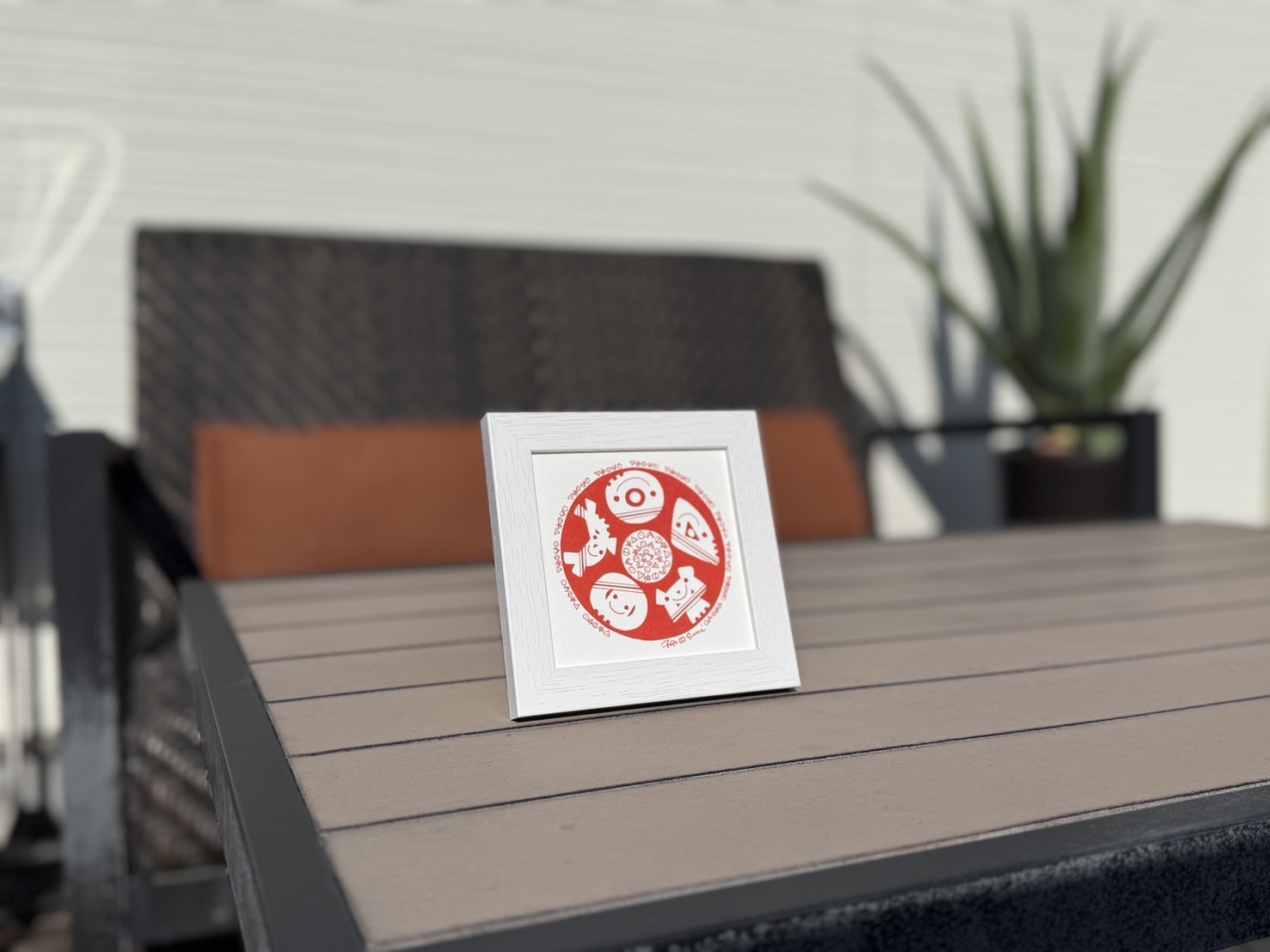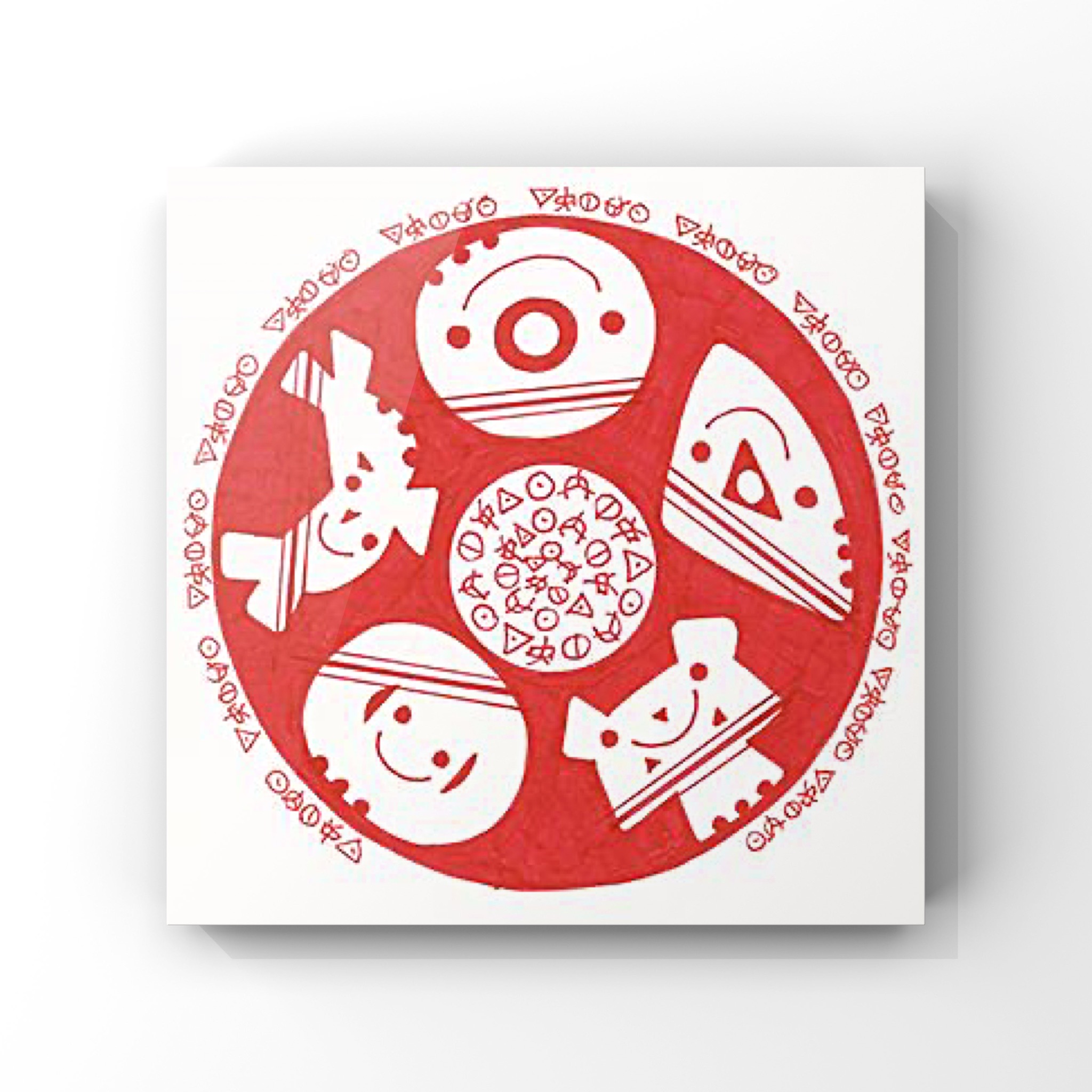 この作品は、紅白のカラーを用いたシンプルで力強い作品です。紅白の赤は「喜び」、白は「始まり」を象徴し、人生の新たな出発とその中にある喜びを表現しています。さらに、ヲシテ文字で描かれた「ありがとう」という言葉が、この作品に深い感謝と祈りを込めています。「ありがとう」は、持つ者の発展と繁栄を願うメッセージであり、作品全体が未来への希望や成功を祈る象徴的な存在となっています。紅白の調和は伝統的な日本文化を感じさせつつ、ヲシテ文字が持つ古代の神秘と現代の感謝が融合した、力強くも温かな作品です。